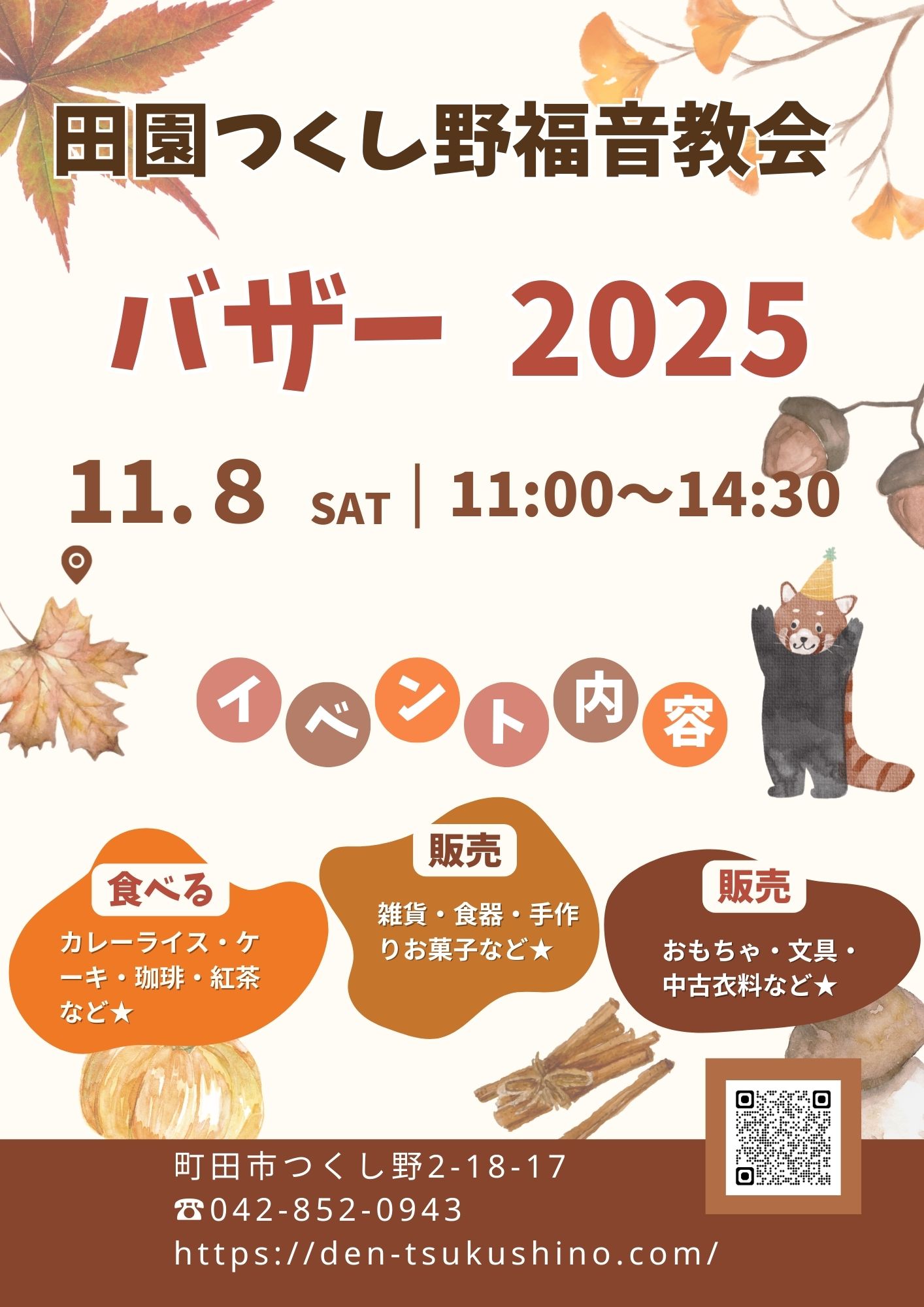 この秋も、田園つくし野福音教会でバザーを開催いたします。当日は、雑貨・食器・手作りお菓子・おもちゃ・文具・中古衣料など、さまざまな品を販売いたします。また、カレーライスや手作りケーキ、コーヒーや紅茶などの軽食もご用意しております。どうぞお気軽にお立ち寄りください。